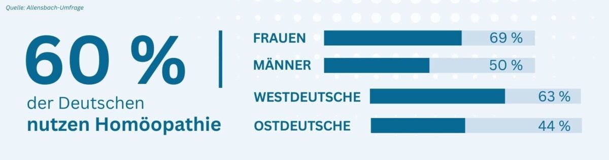 - Frauen nutzen Homöopathie deutlich häufiger (69 %) als Männer (50 %).