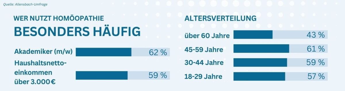 Homöopathie ist in Deutschland in allen Bevölkerungsgruppenweit weit verbreitet. Besonders Frauen, Menschen mit höherem Bildungsniveau und höherem Einkommen sowie mittleren Alters nutzen homöopathische Arzneimittel besonders häufig.